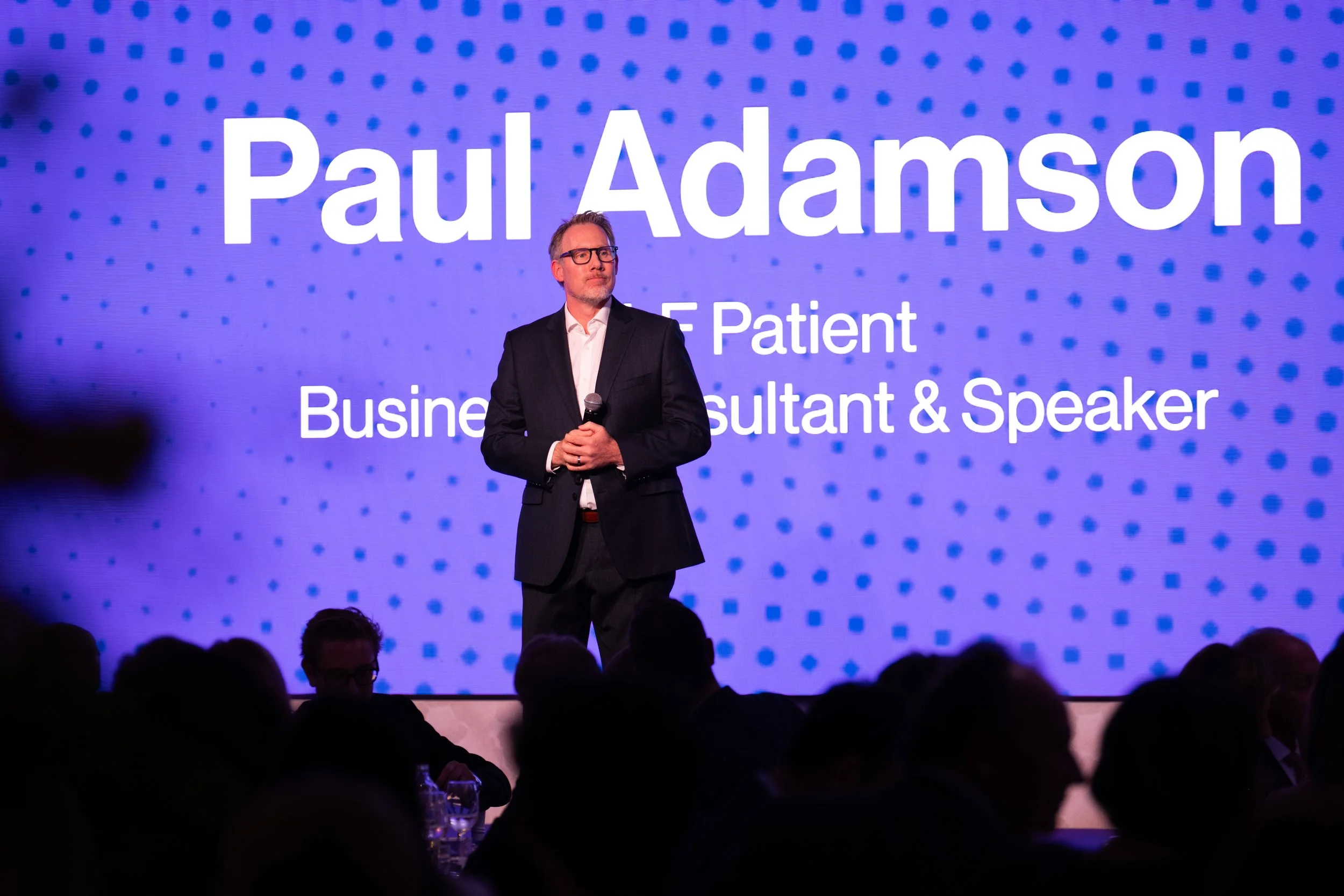 Paul Adamson on stage for the Follicular Lymphoma Foundation in front of a large display with the text 'Paul Adamson, Patient, Business Consultant & Speaker' in white letters on a purple background with blue dots.
